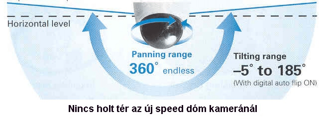2. ábra Mozgáskövetés A manuális és az előre programozott mozgásfajtákon túlmenően a kamera önálló mozgáskövetésre is alkalmas. A beépített képfeldolgozó algoritmus a mozgást felismeri és a látótér legnagyobb mozgó objektumán, igyekszik tartani a forgózsámolyra szerelt kameraegységet. Telemetria A kamera távvezérlés szempontjából meglehetősen rugalmas, a folyamatosan bővülő többszörös protokollkészlet, mint pl. SSP, PELCO-C, PELCO-D együttműködési hajlandóságot mutat más gyártók közismert rendszereivel is. A vezérlés fizikailag sodrott érpáron (RS 485) és a videó koaxiális kábelén keresztül valósulhat meg, a digitális rögzítő vagy a vezérlőpult lehetőségeinek függvényében. LAN interfész A SANYO konstruktőrök a VCC 9800 speed dóm kamerát nemcsak analóg de hálózatos felhasználásokra is szánták így az opcionális VA-80LAN (JPEG) vagy VA-82LAN (JPEG/H264) modulokkal és a VA-SW3050 rendszerprogrammal IP kameraként is funkcionálhat. -5º – 185º bólintási tartomány A VCC 9800 speed dóm kamera mechanikus felépítését tekintve moduláris rendszerű. Kétféle süllyesztett-, egyfajta felületszerelt mennyezeti és egyfajta IP66 klímaállóság kültéri kivitelt kínálnak 24-240 VAC táplálással, füstszínű vagy átlátszó burával. A léptetőmotorok vezérelte futómű egyik érdekességét a fokozott beállási pontosságot már említettem, a másik különlegesség a -5º – 185 bólintási tartomány, ami mennyezeti szerelés esetén a mennyezet alatti teljes félteret belátja beleértve a mennyezeti felület egy részét is! (3. ábra) 3. ábra A kamera szerelése csatlakoztatása egyszerű, szerszámot nem igényel köszönhetően az újszerű kétkaros rögzítő mechanizmusnak, ahol a rögzítő karok kioldása és zárása egyúttal a tápfeszültség biztonságos ki és bekapcsolását is végzi. Ecsedi Ákos – CAMEO Plus Kft. |